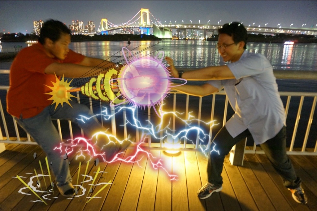 Sembari asik menikmati pemandangan malam di Odaiba, kami pun menyempatkan diri untuk belajar Kamehame di pelataran dekat jembatan Odaiba: (hehe…)
